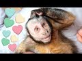 Capuchin MonkeyBoo and baby monkey Happy snuggle and play on the bed! Watch MonkeyBoo settle down for a nap and even talk to you in this super cute video!