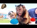 Capuchin MonkeyBoo and baby monkey Happy enjoy some refreshing snow cones on a hot summer day! Then these cute monkeys have a blast playing some corn hole with their pet human Pete. It’s just another day in the life of MonkeyBoo! These cute pet monkeys sure are loved!
